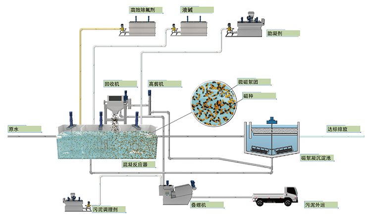 其中,在關(guān)鍵工藝“二級除氟沉淀池”段采用了一套50000T/d磁混凝沉淀配套水處理設(shè)備。該設(shè)備依據(jù)重介質(zhì)加載沉淀原理,通過向污水中投加適量可循環(huán)利用的磁種,并使磁種均勻分散到水體中形成微小晶核,以此強(qiáng)化絮凝效果,并最終形成高密度絮凝體(磁種密度為水密度的5.1倍),依靠重力作用和斜管(板)沉淀原理實現(xiàn)固液的高速沉淀分離。同時輔以部分污泥回流系統(tǒng)以增強(qiáng)去除效果和降低藥劑費用。